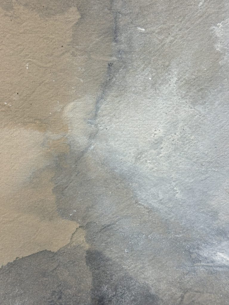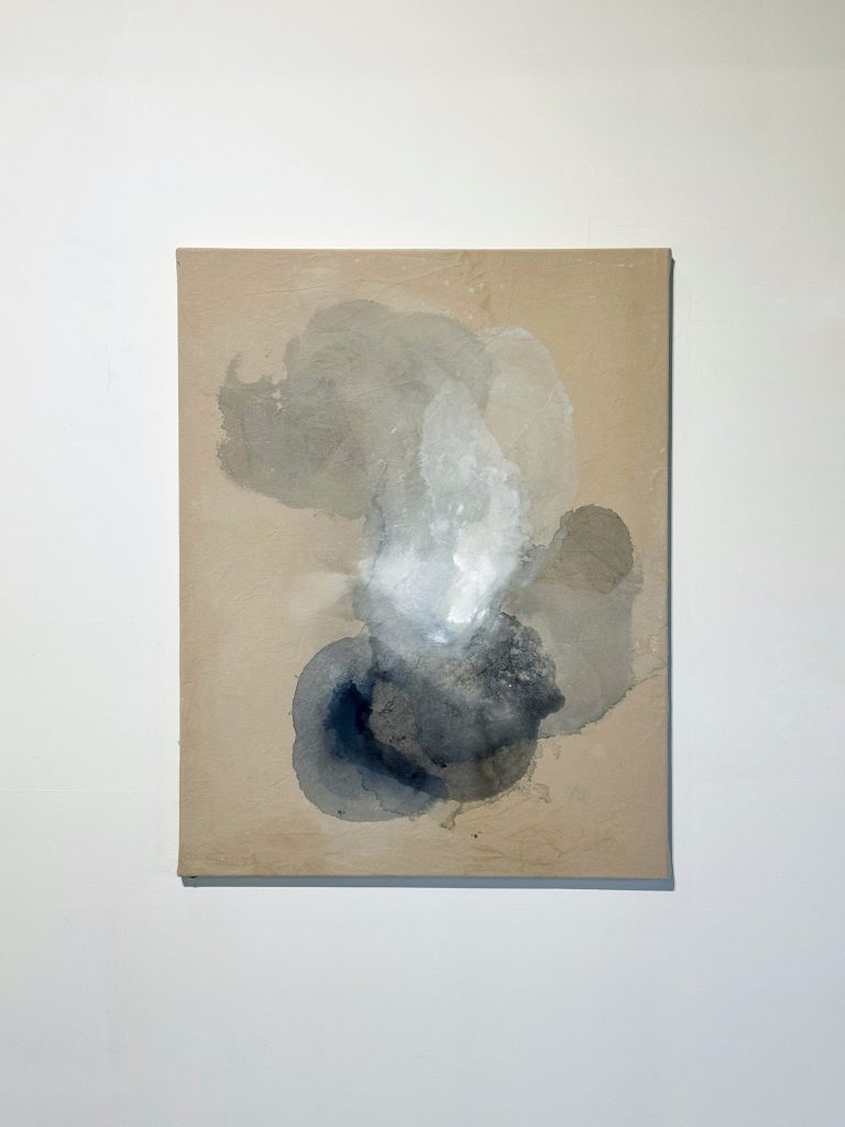 Los materiales reflejan esta búsqueda, al convivir la poética de las fibras de algodón, sus tejidos teñidos de tintes naturales con la dureza y lo sintético del acrílico, dando lugar a un lenguaje único, tan particular en cada uno de nosotros, con nuestros grises y vicisitudes de cada día.