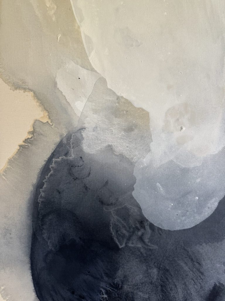 Es una técnica que celebra la historia de cada objeto, destacando sus fracturas en lugar de ocultarlas. Esta pieza ha estado en mi taller por mucho tiempo. La tomaba, la observaba, la intervenía con tintes, grafito y otros materiales. Hubo meses en los que no pude ni mirarla, y otros en los que volví a enamorarme de ella.
