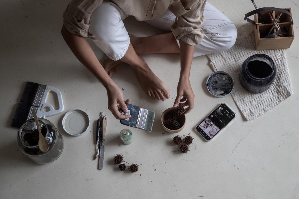 Cuando empecé a pintar estaba embarazada de mi tercer hijo. Recuerdo esa etapa como un lienzo en blanco: había algo que se gestaba adentro y afuera, en paralelo. Mis primeras obras fueron con acrílicos —un material con el que todavía experimento en algunas piezas—, pero en ese momento me nació una incomodidad: quería expresarme de una manera que no contaminara tanto, que estuviera más en sintonía con la tierra que tanto me inspira.